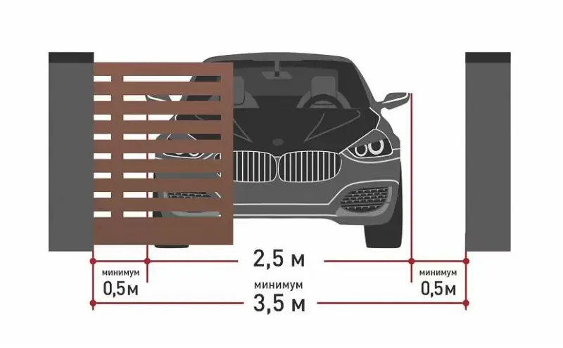 Для легковых машин оптимальная ширина ворот составляет 3–3,5 метра, для грузовых и спецтехники — от 3,5 до 4 м, а для двойного проезда — от 5,5 м. Если пространство ограничено, ворота можно сдвинуть вглубь участка на 1–1,5 м.