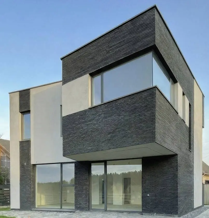 - Эстетика. Тонкие рамы антрацитового цвета гармонируют с фальцевой кровлей и фасадом. Остекление выглядит легким и не перекрывает вид на природу.